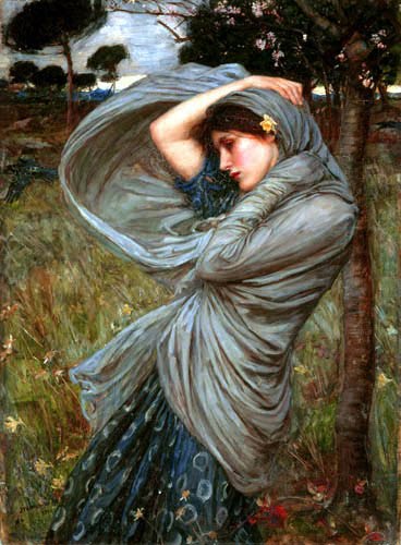 En la mitología griega , Bóreas (en griego Βορέας, ‘viento del norte’ o ‘devorador’) era el dios griego del frío viento del Norte que traía el invierno . Bóreas era muy fuerte y tenía un violento carácter a la par. Los griegos creía que su hogar estaba en Tracia , y tanto Heródoto como Plinio describen una tierra al norte llamada Hiperbórea (‘más allá de Bóreas’) en la que la gente vivía en completa felicidad hasta edades extraordinariamente longevas. También se decía que Bóreas había secuestrado a Oritía , una princesa ateniense , del río Iliso . Oritía era el nombre de una hija de Erecteo y de Praxitea , reyes de Atenas , de la que el dios-viento Bóreas se enamoró ardientemente. El padre de la joven se negó a permitir esta unión, por el frío que reinaba en Tracia , donde vivía el pretendiente, y por el mal recuerdo que los reyes de este país habían dejado en Atenas. Pero lejos de disuadirle, esta negativa aumentó aún más el furor de Bóreas, que levantando terribles torbellinos de viento raptó a la princesa y la trasladó a Tracia, donde reina con él desde entonces. Allí Oritía le hizo padre de dos niños al que luego les saldrían alas, Zetes y Calais , y de dos hijas más: Quione y Cleopatra . Según Platón esta narración evoca un suceso real, cuando una princesa ateniense fue arrojada por el viento al mar, donde murió ahogada. El nombre de Oritía, del griego oros (montaña) y giein (sacrificar), parece hacer refencia a que la joven iba a las montañas a celebrar sus misterios mágicos. Desde entonces, los atenienses veían a Bóreas como un pariente político. Cuando Atenas fue amenazada por Jerjes , la gente rezó a Bóreas, de quien se dice que propició vientos que hundieron 400 barcos persas. Un suceso similar había ocurrido doce años antes, y Heródoto escribe: Ahora no puedo decir si fue esto por lo que realmente los persas fueron sorprendidos anclados por la tormenta, pero los atenienses están bastante seguros de que, al igual que Bóreas les había ayudado antes, igualmente era responsable de lo que ocurrió también en esta ocasión. Y cuando volvieron a casa construyeron al dios un altar junto al río Iliso. Aurora, diosa romana del amanecer; Boreas, dios griego cuyo nombre da origen al viento.